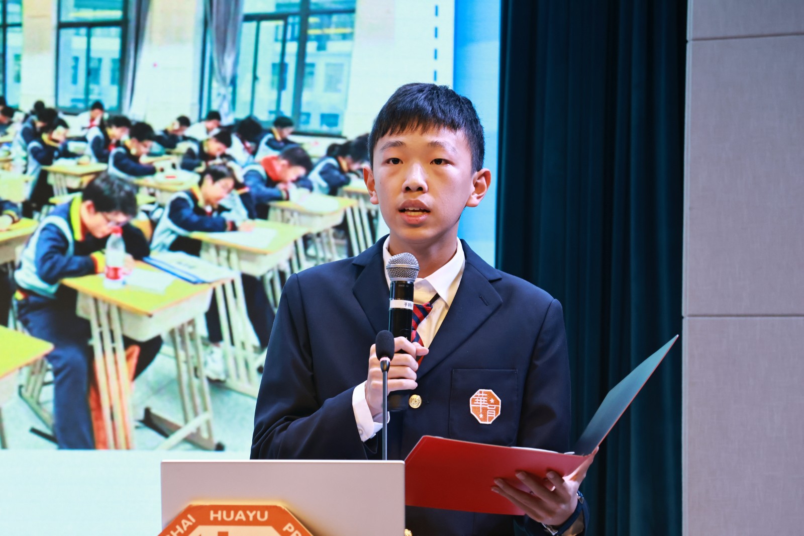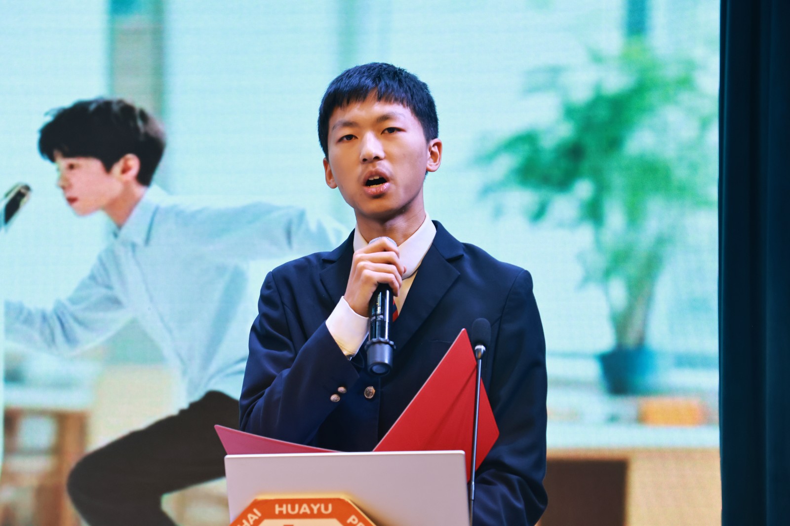 他分享的主题是“厚积深耕,行稳致远”。踏入华育以来,他始终以严谨态度深耕学业,两学年综合成绩稳居年级前列,先后斩获华育学业一等奖、二等奖,今年寒假首次挑战第22届泛珠三角物理竞赛基础试,便收获一等奖佳绩,深刻领悟“厚积方能薄发”的内涵。这份成长离不开集体滋养,刚入学时他曾因浮躁碰壁、陷入自我怀疑,在27届8班互助共进的氛围中,在班主任引导下,他和同学制定计划、请教问题,褪去浮躁、踏实前行。学校丰富的竞赛课程的和“竞赛金牌回母校”活动让他深受启发,李元柯等学长分享的专注自律、坚守热爱的故事,传递着华育精神,成为他的榜样。新学期,他将和27届8班的同学们继续以勤为桨、厚积深耕、行稳致远。
