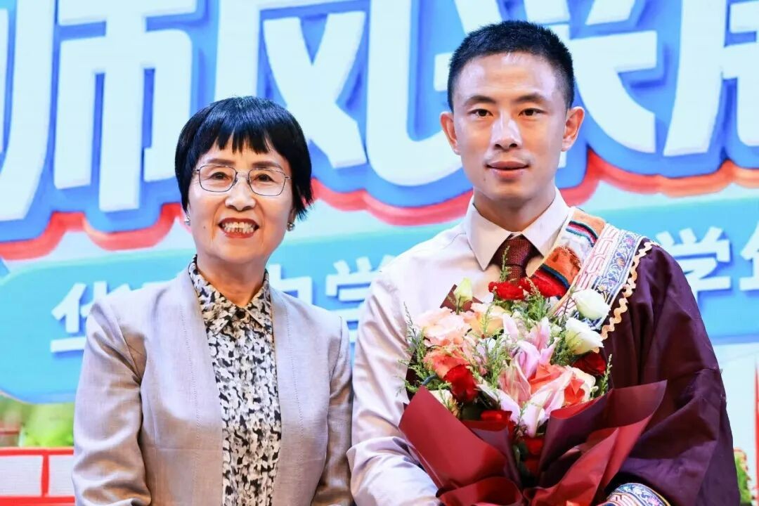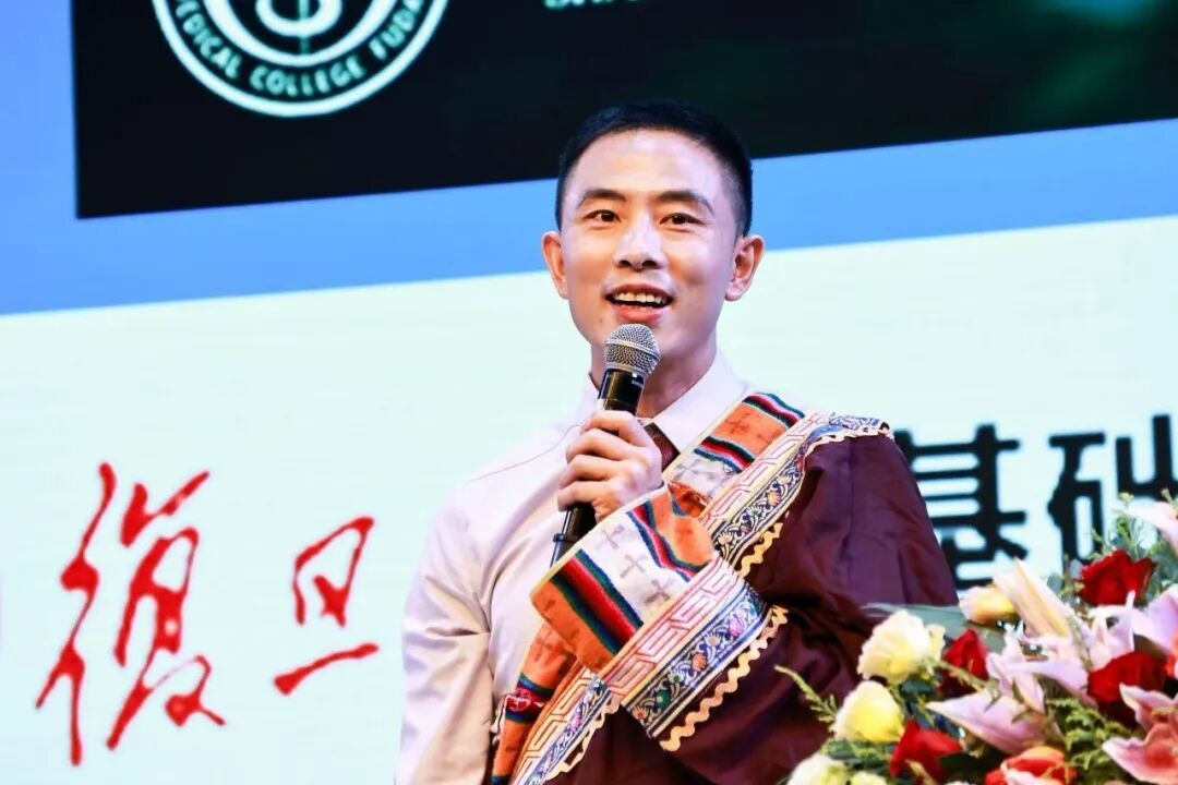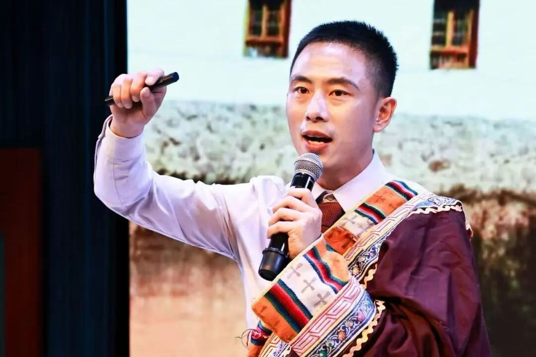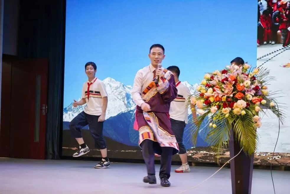首先上台展示风采的是数学组的罗家亮老师。一身活力的罗老师以“很长的路,才走到这里”为题,讲述了自己从法医专业毕业生到数学教师的非凡转变。毕业后经历职业迷茫的他,因深受校友马骅支教事迹的感召,于2009年前往云南德钦县普利藏文学校,开始了三年支教生涯。为融入当地,他晒黑皮肤、取藏名、学藏歌,与孩子们同吃同住,共同劳动,在物资匮乏、交通险峻的艰苦环境中坚持教学,也收获了深厚的师生情谊。他感恩阿牛校长创办学校的壮举,缅怀为支教奉献生命的马骅与扎西老师,并从中汲取到希望与爱的力量。如今,他将这份经历带来的勇气与信念传递给华育学子,鼓励大家珍惜当下、努力前行。扎西得嘞!