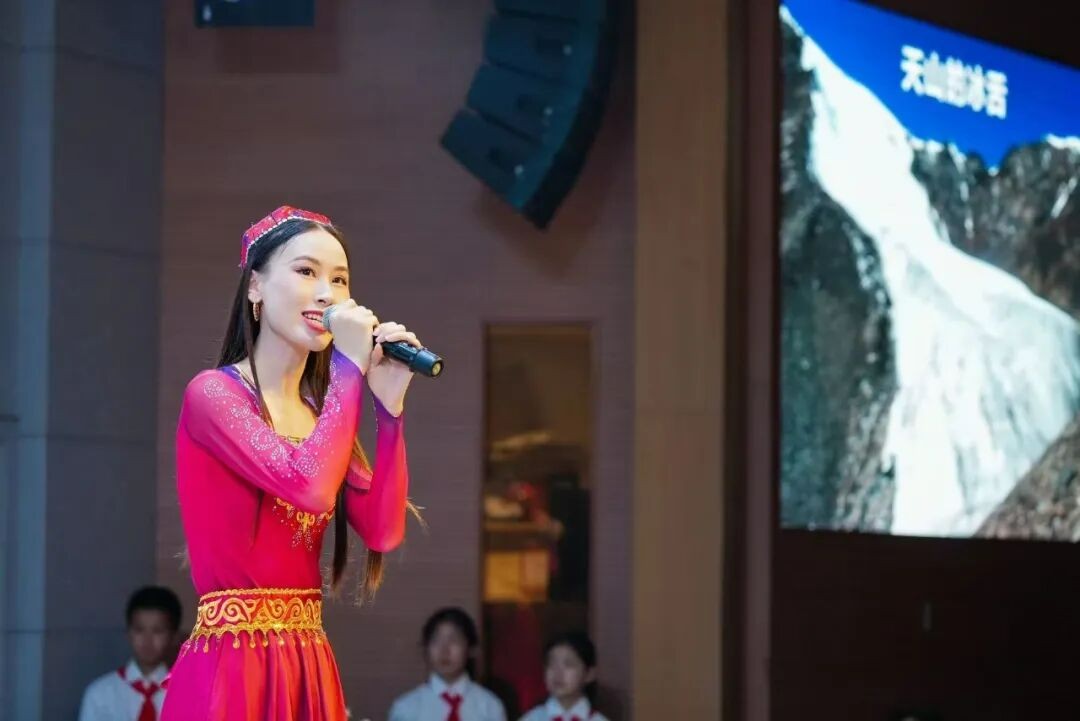 最后登场的是史地组朱咏琦老师。身着维吾尔族服饰的她,以“我的第二故乡——新疆”为题,带来一段充满地理魅力和人文温度的分享。她从帕米尔高原的雪豹讲到赛里木湖的苏醒,用“三山夹两盆”生动解读新疆地貌,讲述冰川融水如何滋养绿洲、强烈日照如何孕育甜蜜物产。朱老师幽默调侃新疆的“孜然味”方言、惊人的距离尺度——“乌鲁木齐刚出红绿灯,两小时已过去”,以及晚上十点太阳仍“加班”的奇妙时差。她更分享了当地人热情洋溢的待客之道,传递出新疆人淳朴、乐观的性情。这片土地赋予她敬畏与豁达,教会她真诚与分享。最后,她以歌声表达对故乡的眷恋,并祝愿每个人都能走出属于自己的多彩人生路。